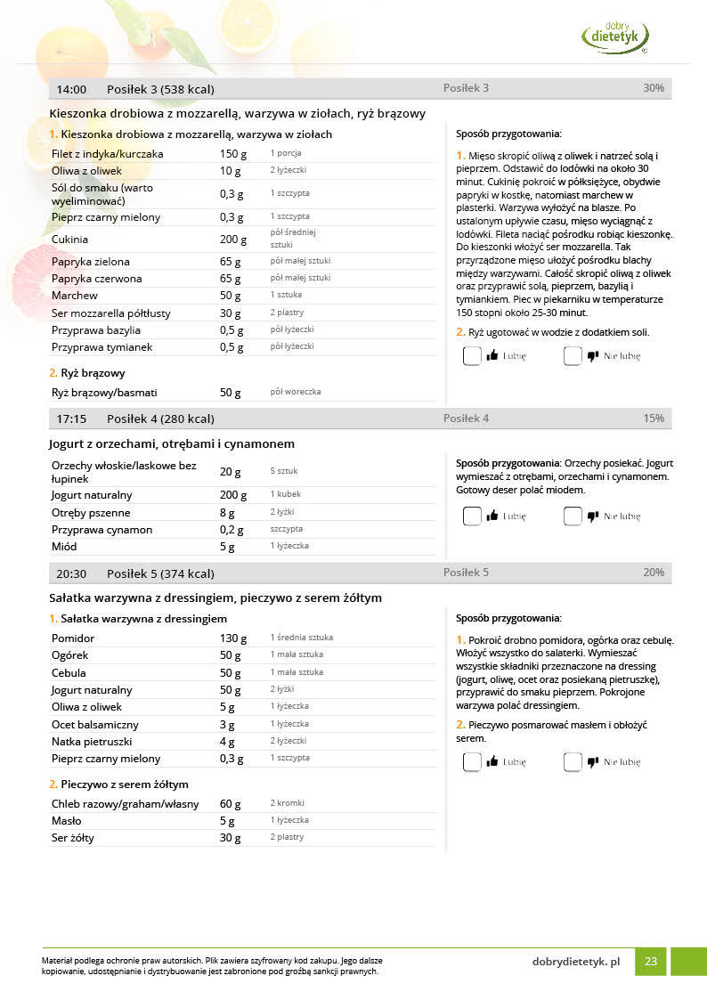 w formie propozycji posiłków (zamiast pojedynczych jadłospisów jednodniowych, przygotowano propozycje kilku propozycji dań na każdy posiłek). Tutaj nie uzależniamy Cię od tego jakie masz np. w danym dniu zjeść śniadanie czy obiad, tylko sam wybierasz sobie ulubione danie z kilku przedstawionych przez nas propozycji.