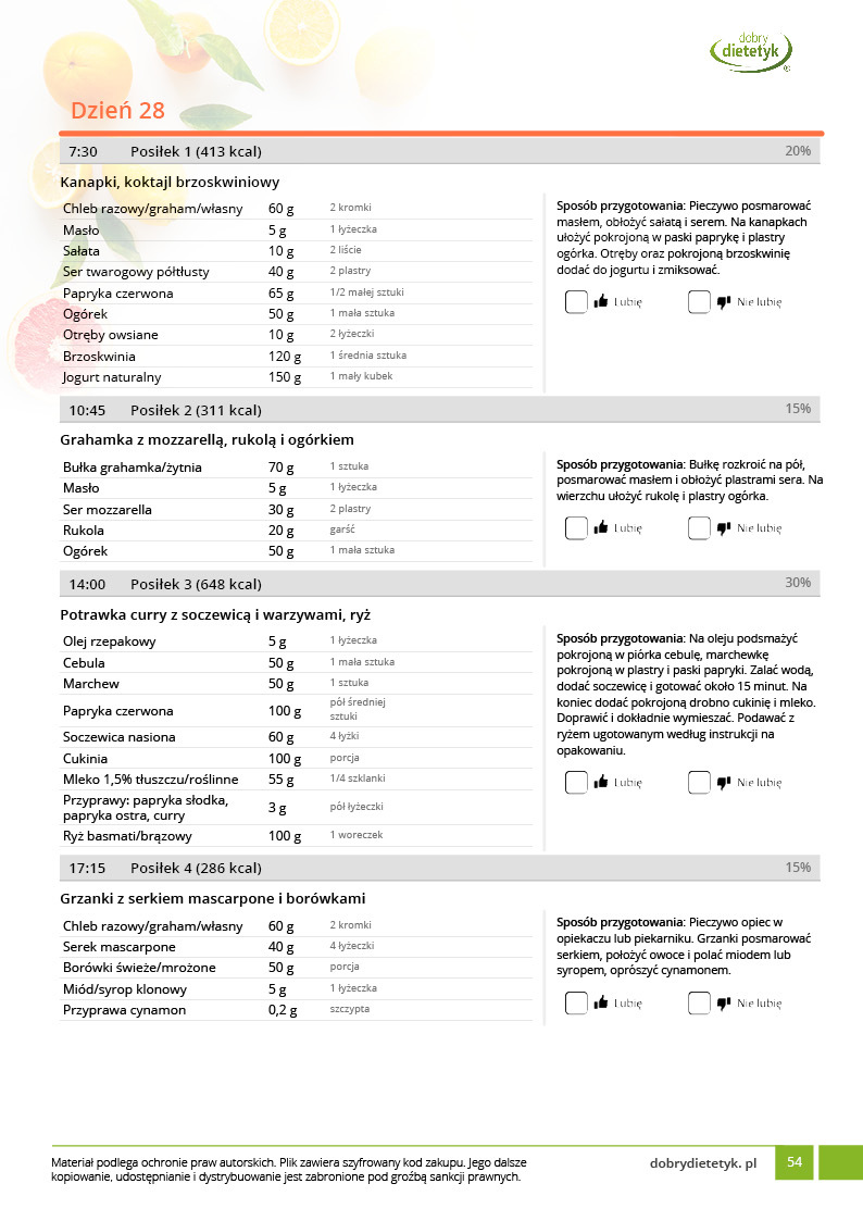 w formie propozycji posiłków (zamiast pojedynczych jadłospisów jednodniowych, przygotowano propozycje kilku propozycji dań na każdy posiłek). Tutaj nie uzależniamy Cię od tego jakie masz np. w danym dniu zjeść śniadanie czy obiad, tylko sam wybierasz sobie ulubione danie z kilku przedstawionych przez nas propozycji.