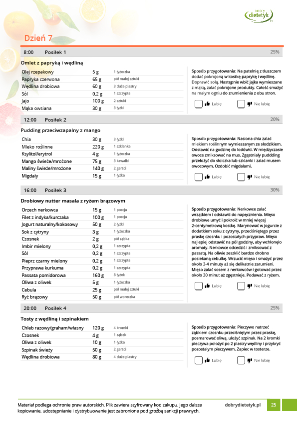 w formie propozycji posiłków (zamiast pojedynczych jadłospisów jednodniowych, przygotowano propozycje kilku propozycji dań na każdy posiłek). Tutaj nie uzależniamy Cię od tego jakie masz np. w danym dniu zjeść śniadanie czy obiad, tylko sam wybierasz sobie ulubione danie z kilku przedstawionych przez nas propozycji.
